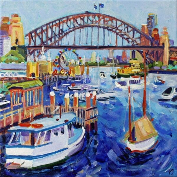 For a long time now I have wanted to experience Vivid in Sydney harbour to see the light show and final, this year I was able to go. The event is absolutely fabulous!! My ‘Vivid Sydney festival of lights series’ was created from that one evening from a vantage point of a cruise boat. These five works are literally a visual diary of that evening – we boarded the boat in the Rocks, sailed pass The Opera House and under the Harbour Bridge, checking out Luna Park, back to the dock, from here we finished the evening by walking to Customs House to view the changing display. My intentions were to celebrate each moment.