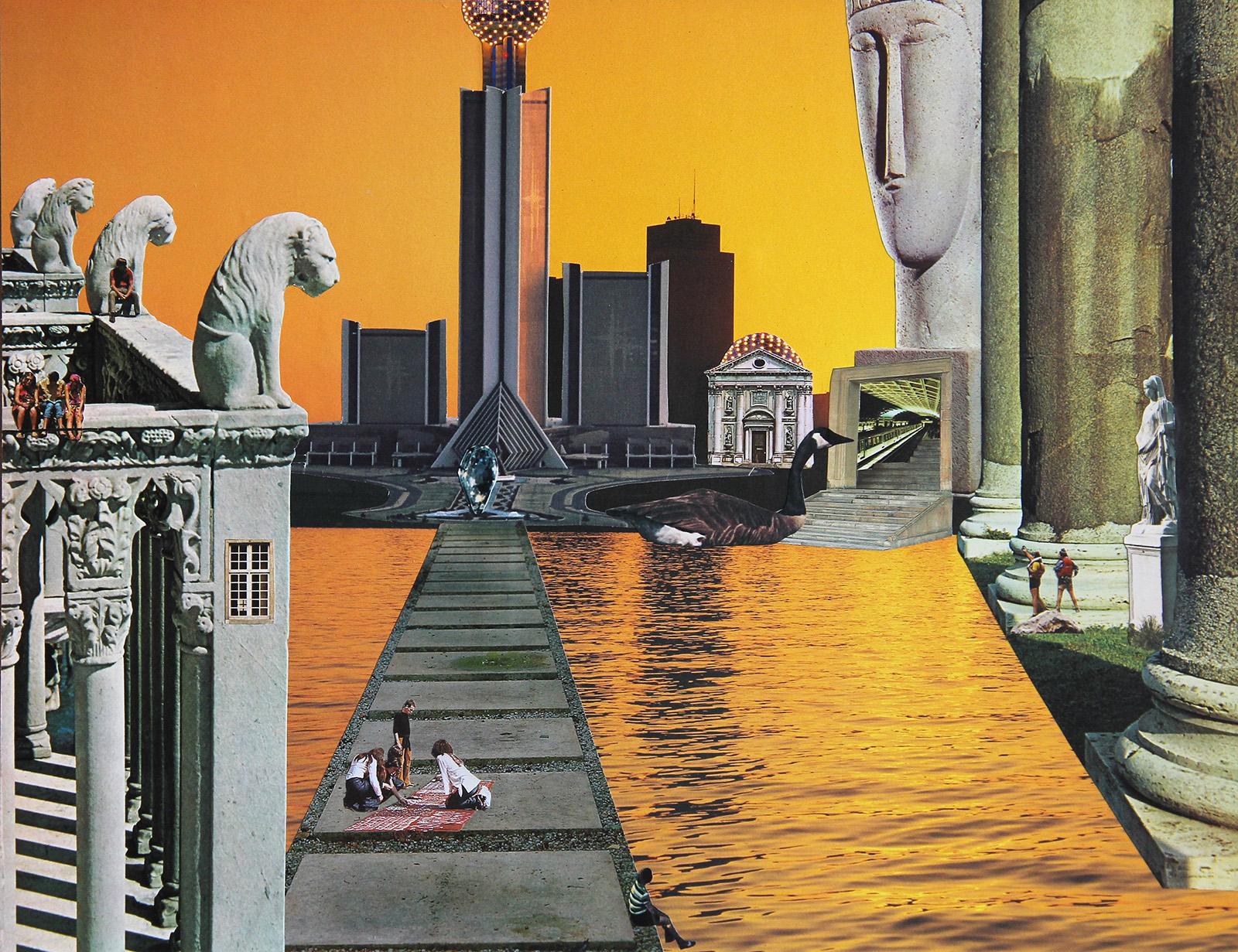 Clintons works are created by combining dozens of meticulously cut pieces which then form a new, alternate world. Using original pages from vintage books as resources means he only gets one chance to cut out these objects and this also creates limitations for size. A recent development of custom-printing backgrounds has allowed Clinton to create largescale works within his seamless photomontage process. Storytelling is an important part of Clintons creations and themes can include Brutalist or Modernist architecture, sci-fi and technology to commenting on the climate crisis or creating portals to another dimension. This retro-futuristic vision of space and science lead to Clinton’s significant involvement in FUTURE, his first regional gallery showing at Casula Powerhouse in 2019 which was selected by ART GUIDE AUSTRALIA as one of the top 5 exhibitions to see nationwide. More recently he was asked to be part of BARE BONES at AIRspace projects, where the artists were asked to respond to the poems of JR Waen and through this project, Clinton returned to a focus on people and humanity, a theme that was prominent in his early Pop-style works from the ‘90’s.