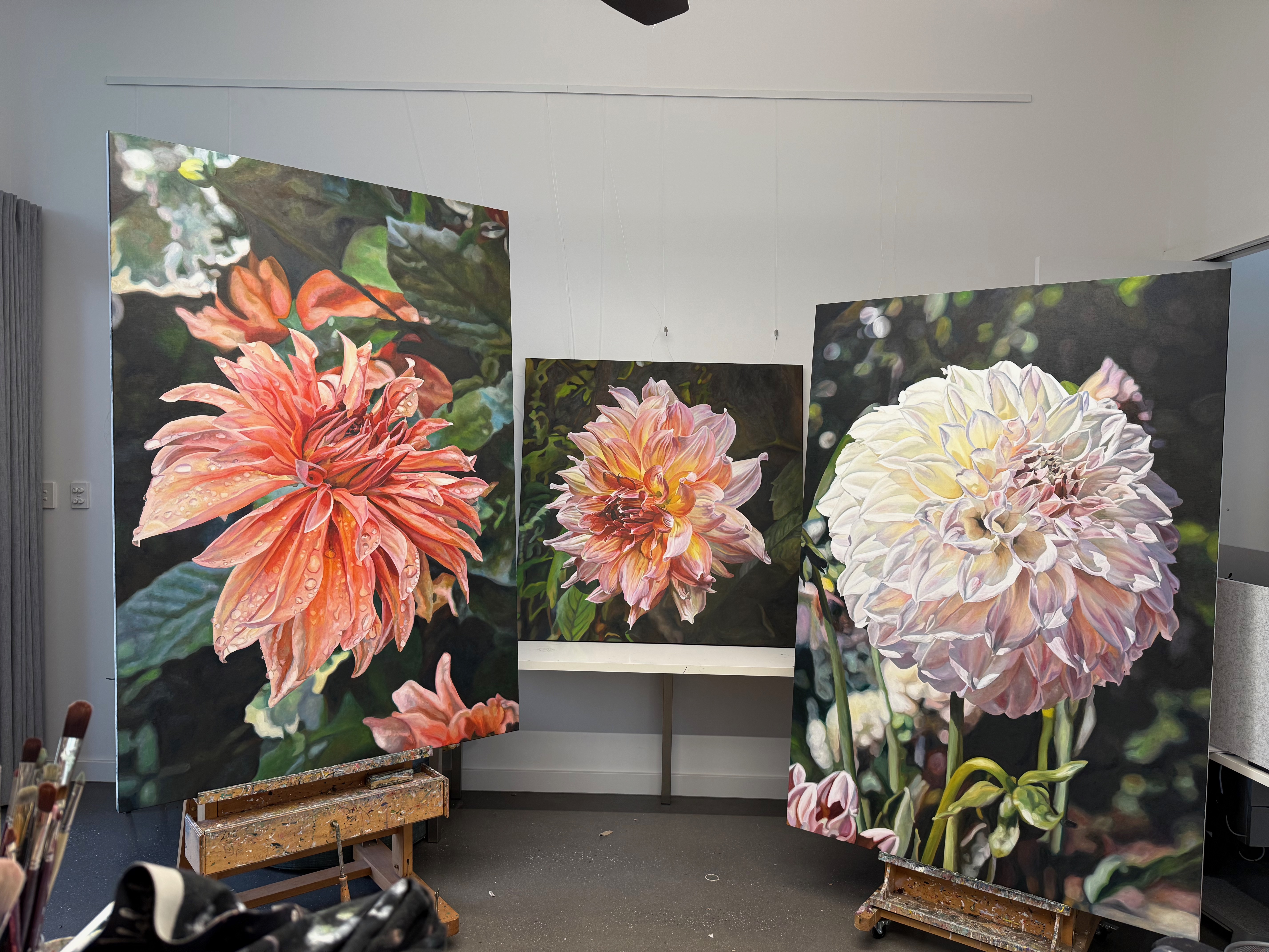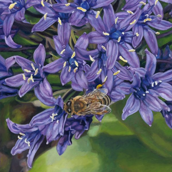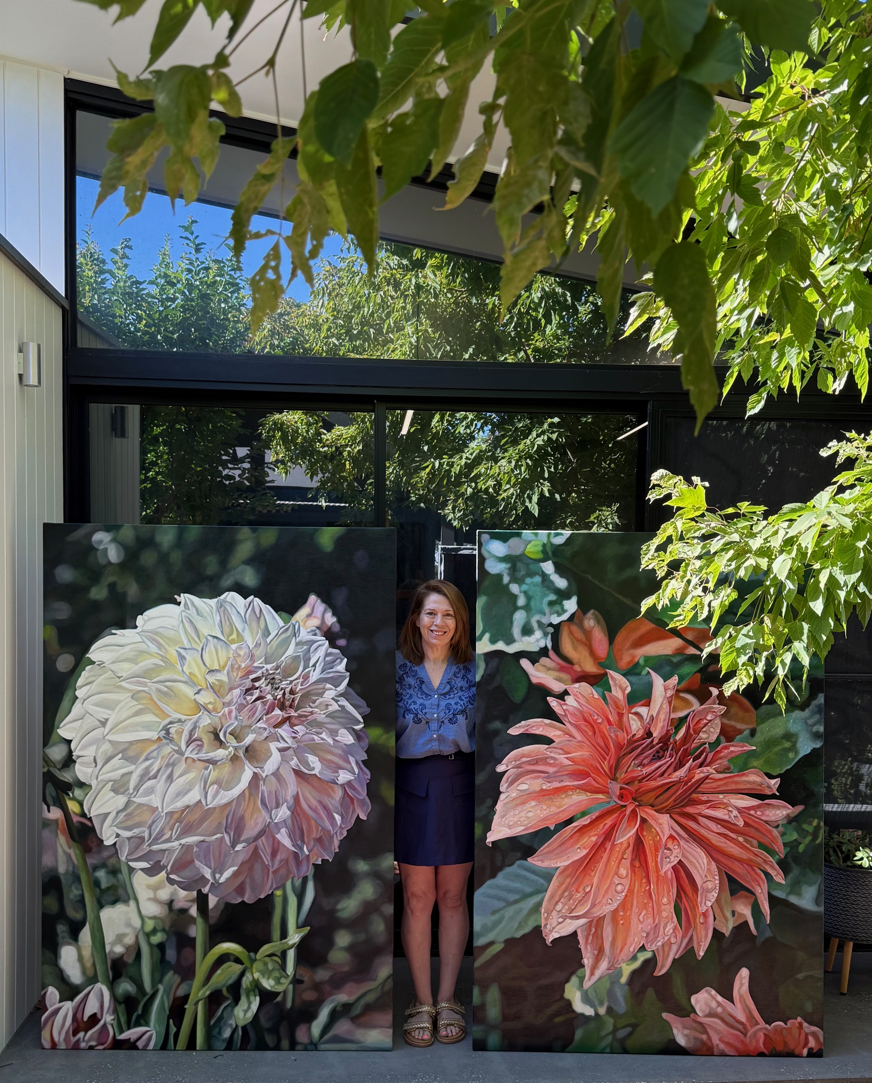 Capturing the fall of light and shadow of dahlias, snapdragons, ranunculi, euphorbia, zinnia and kalanchoe, and begonia – amongst other varieties – the artist achieves precision and a faithful impression through the studious application of paint. In layering the canvas surface using a flat brush blending technique, Poulson builds a tonal richness in her paintings. The resulting art works evoke a sense of rapture.
