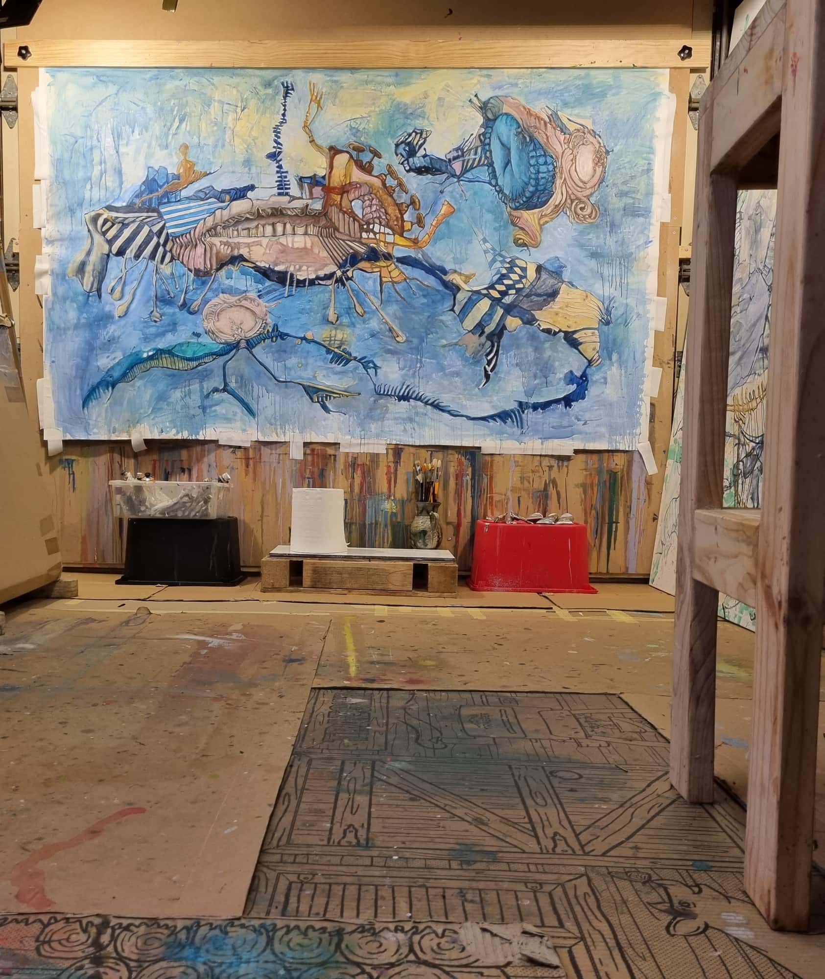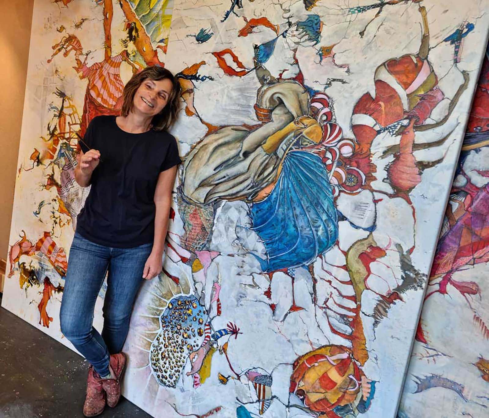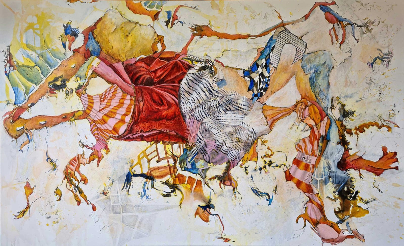 “My work is energetic and exuberant, a direct extension of my imagination. A sense of improvisation is created by means of building within and around the materials. Twisted and contorted shapes placed next to playful patterning conveys a sense of restlessness and the passage of time. The canvas becomes a place where the figurative and realistic collide