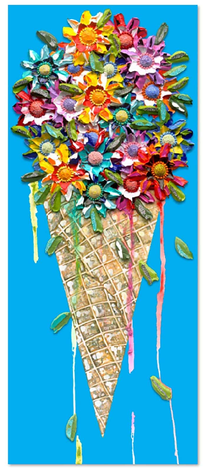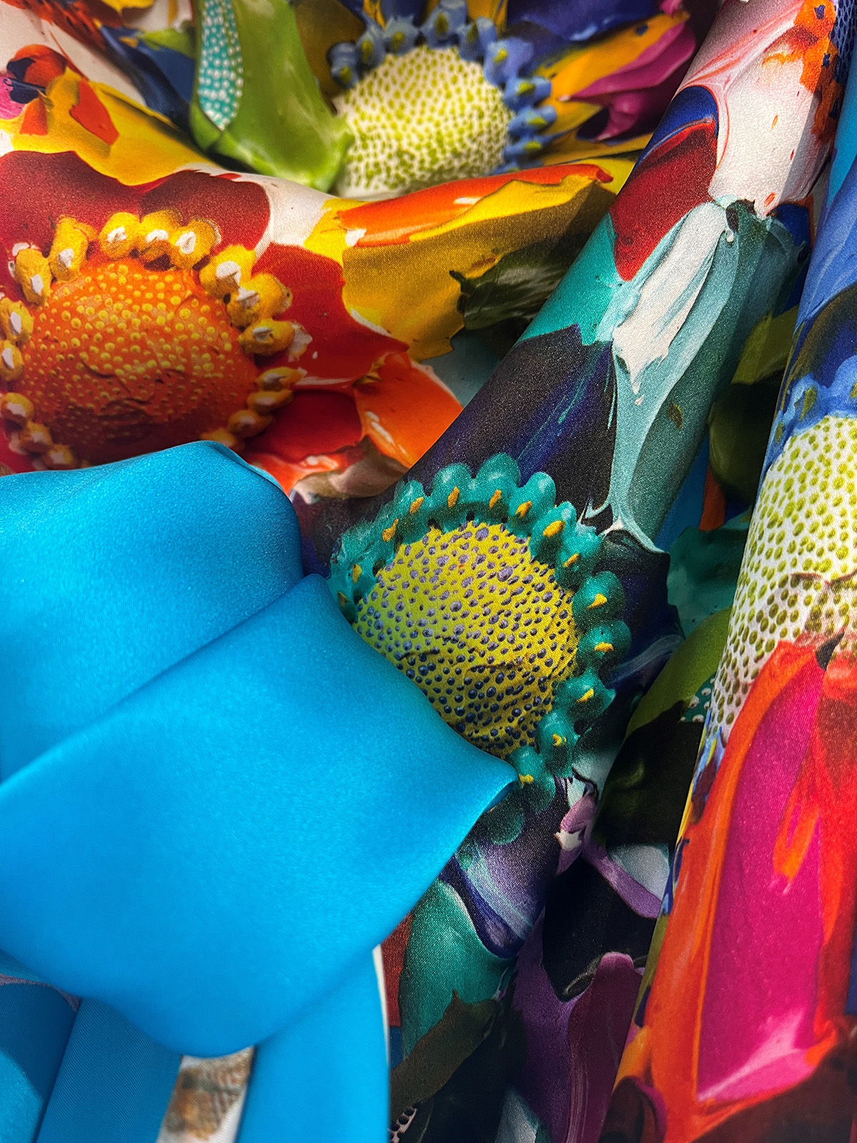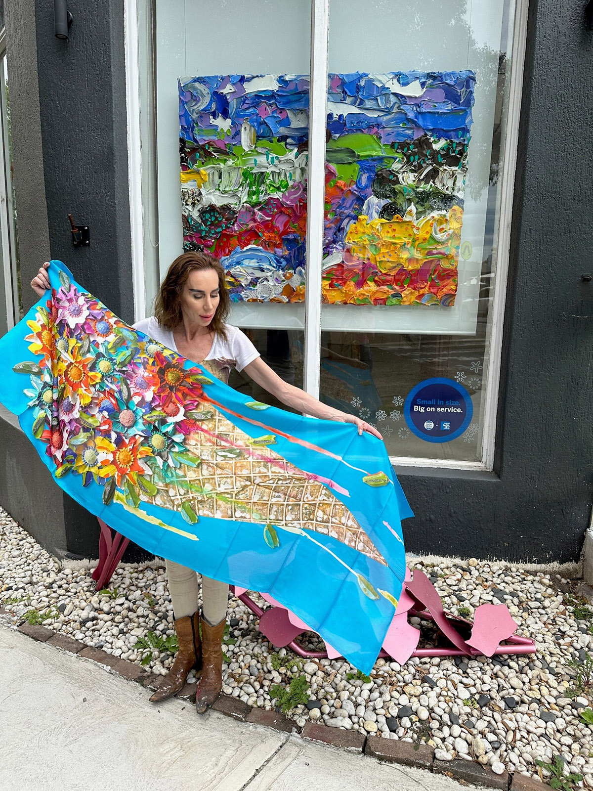 Made with a blend of silk charmeuse and wool, finished with a hand-rolled edge this luxurious scarf design comes from an original Rebecca Pierce artwork titled ‘Cone On Blue’.