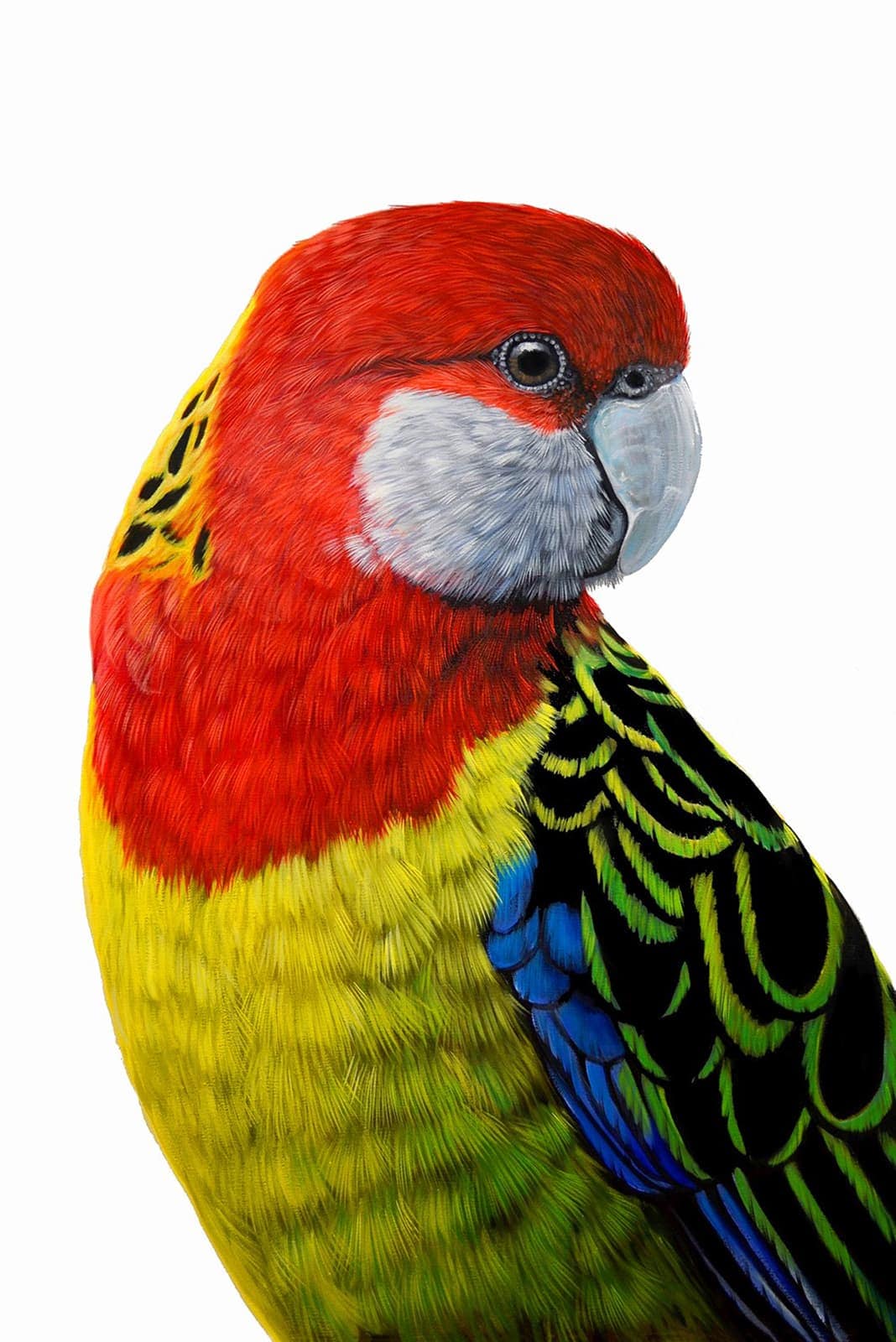 Painting of an Eastern Rosella known for their bright red heads with white cheeks.