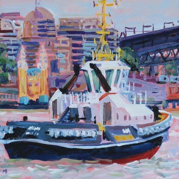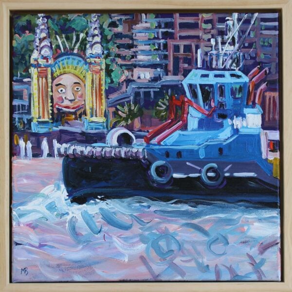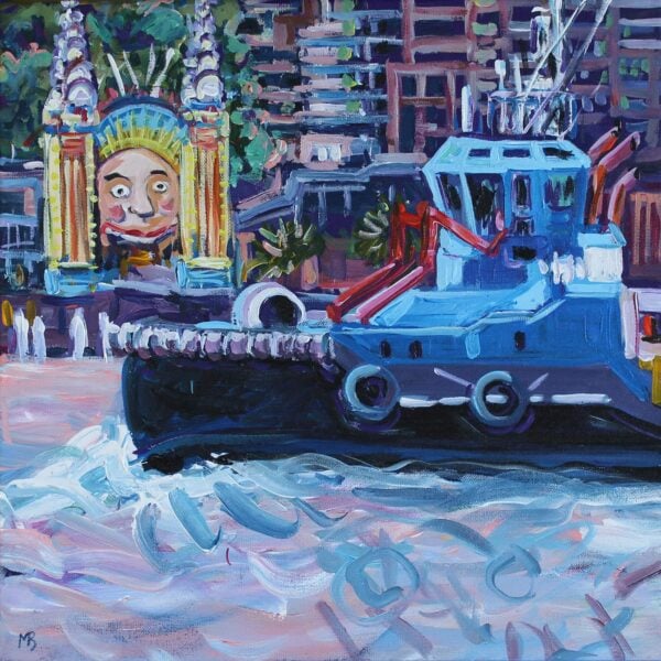 Blue tug passing Luna Park