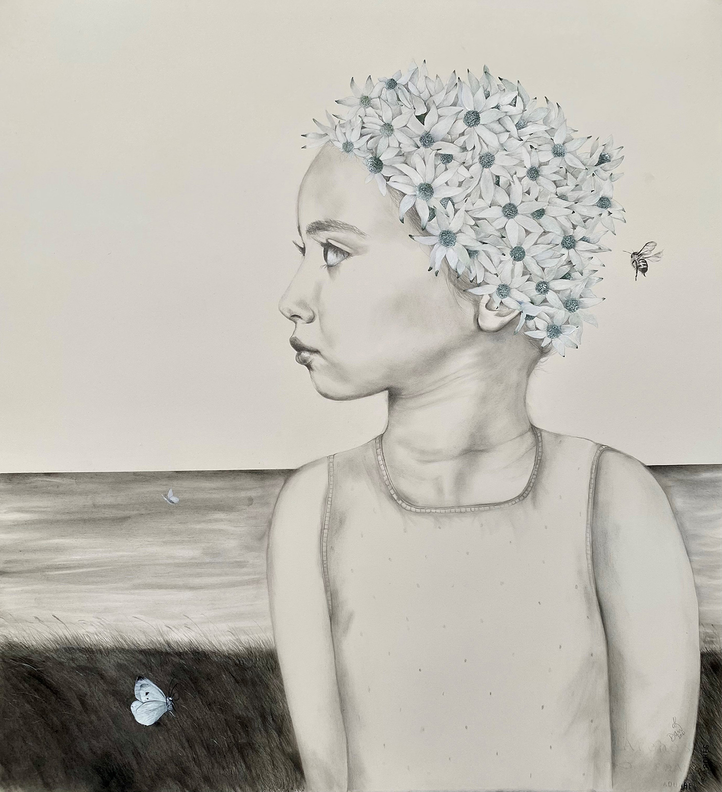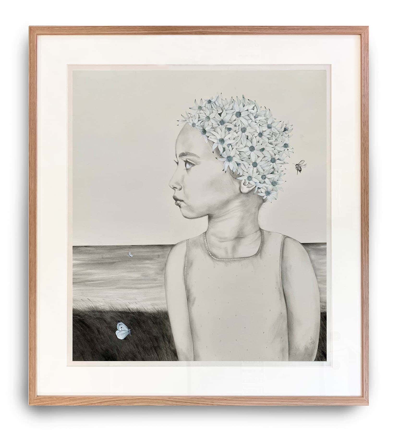 A child in the landscape with a cap of flannel flowers on their head. This work is framed under glass with a white matte board and light-coloured timber frame.