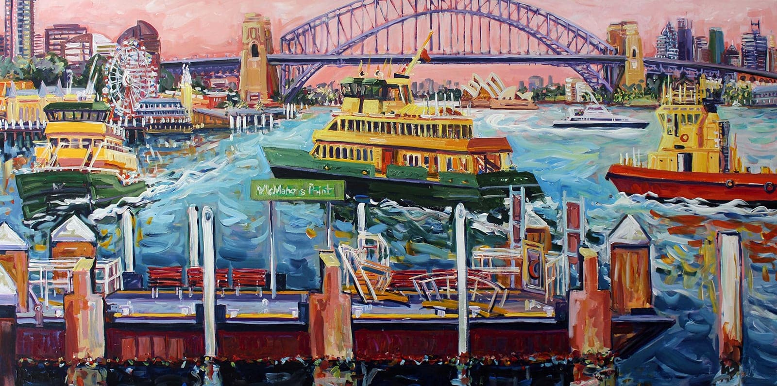 In her work Megan pays homage to beloved Sydney artist, Peter Kingston, who had a deep love for Sydney Harbour and its ferries.
