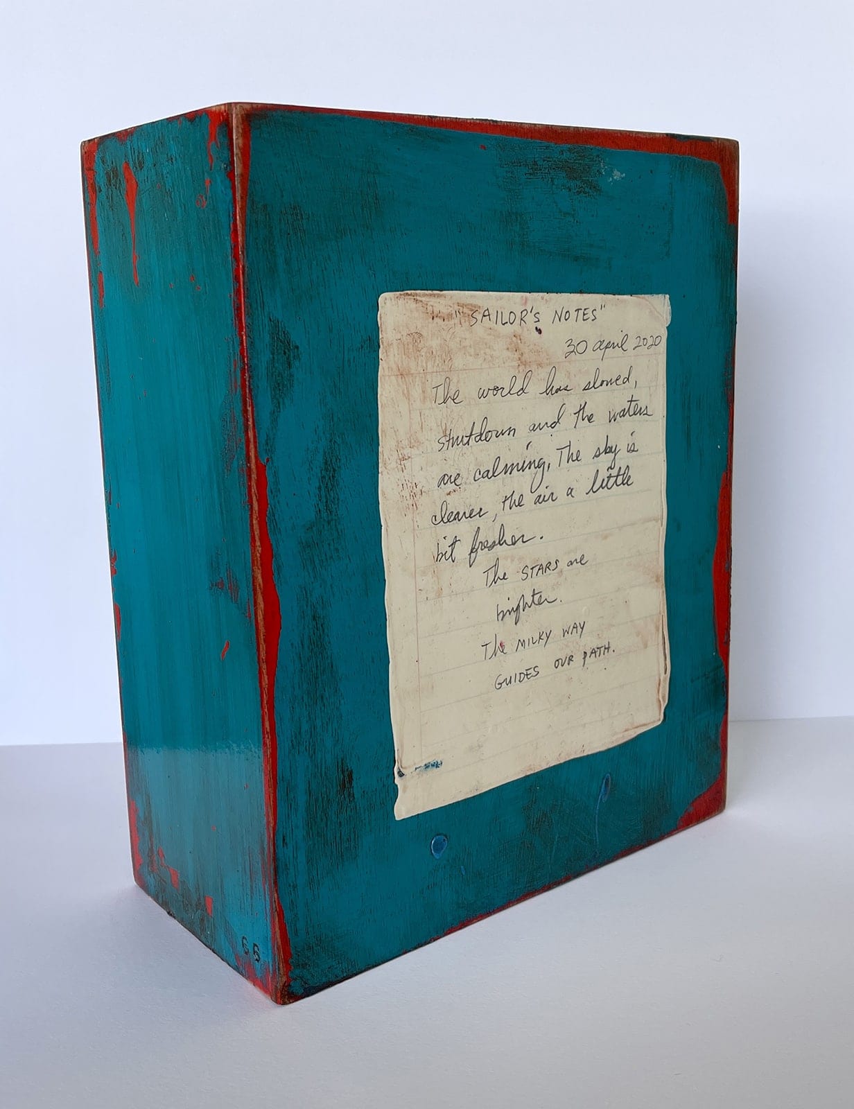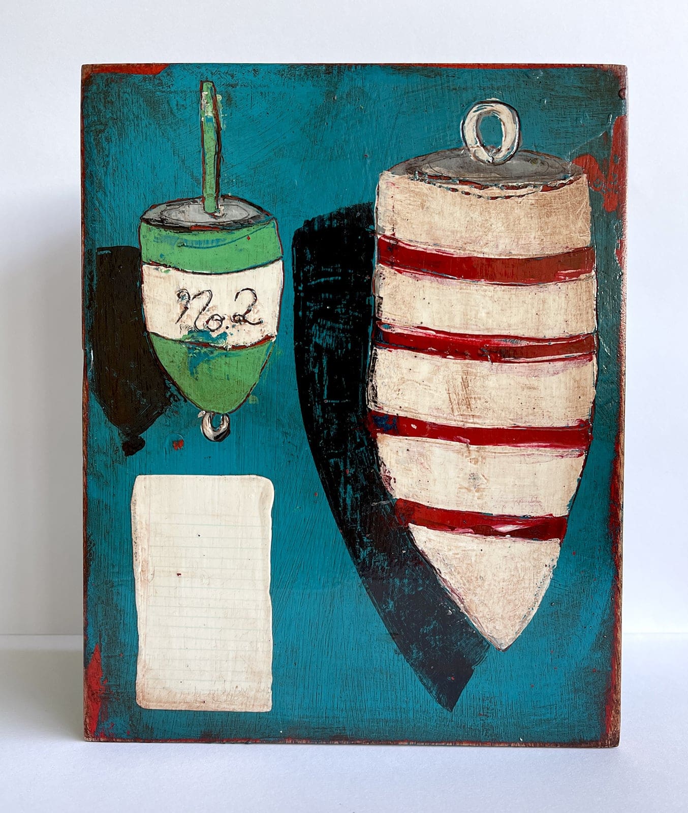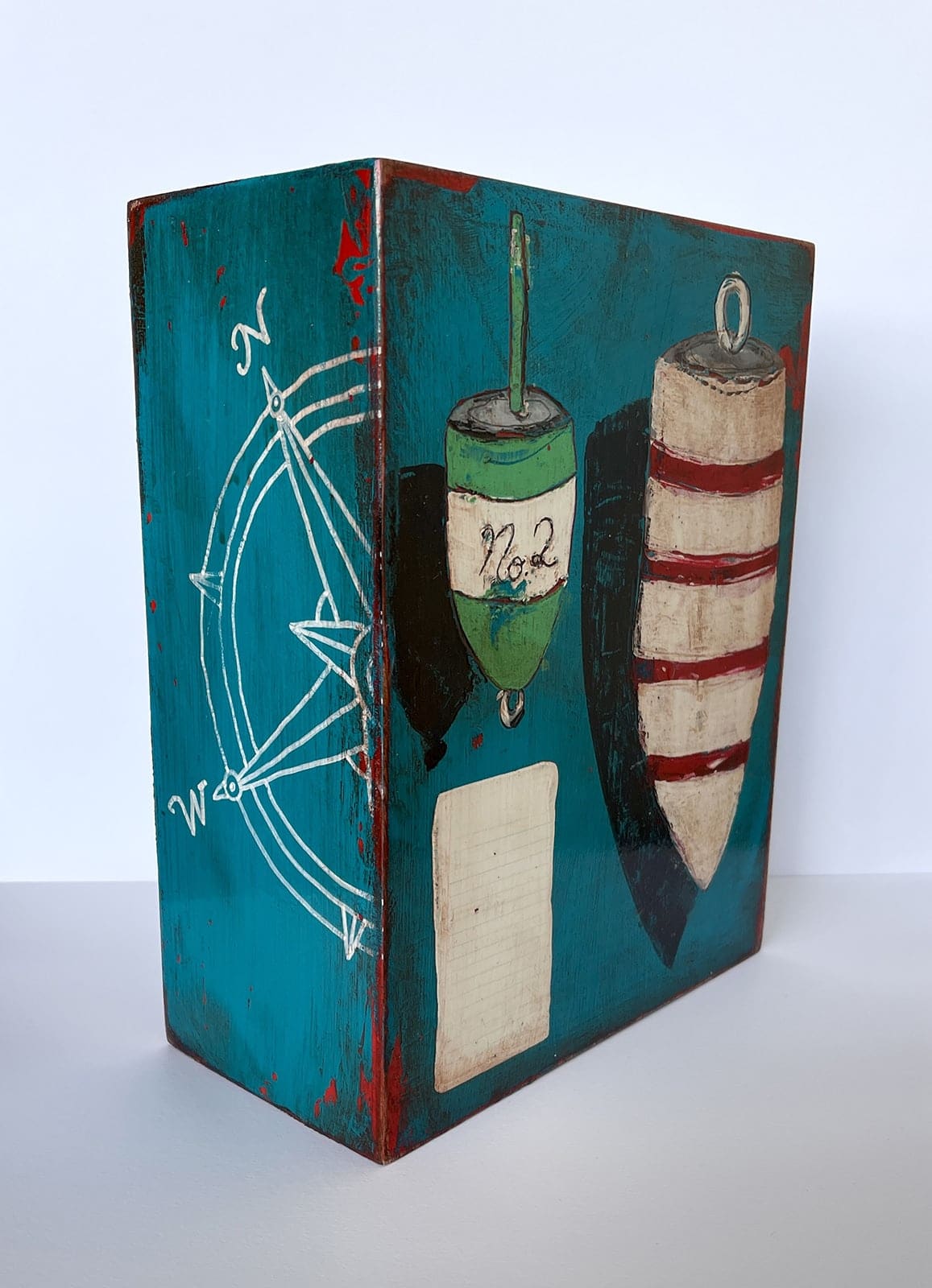 A box, reminiscent of a buoy or an anchor depicting buoys on one side. The other side depicts a note which reads: