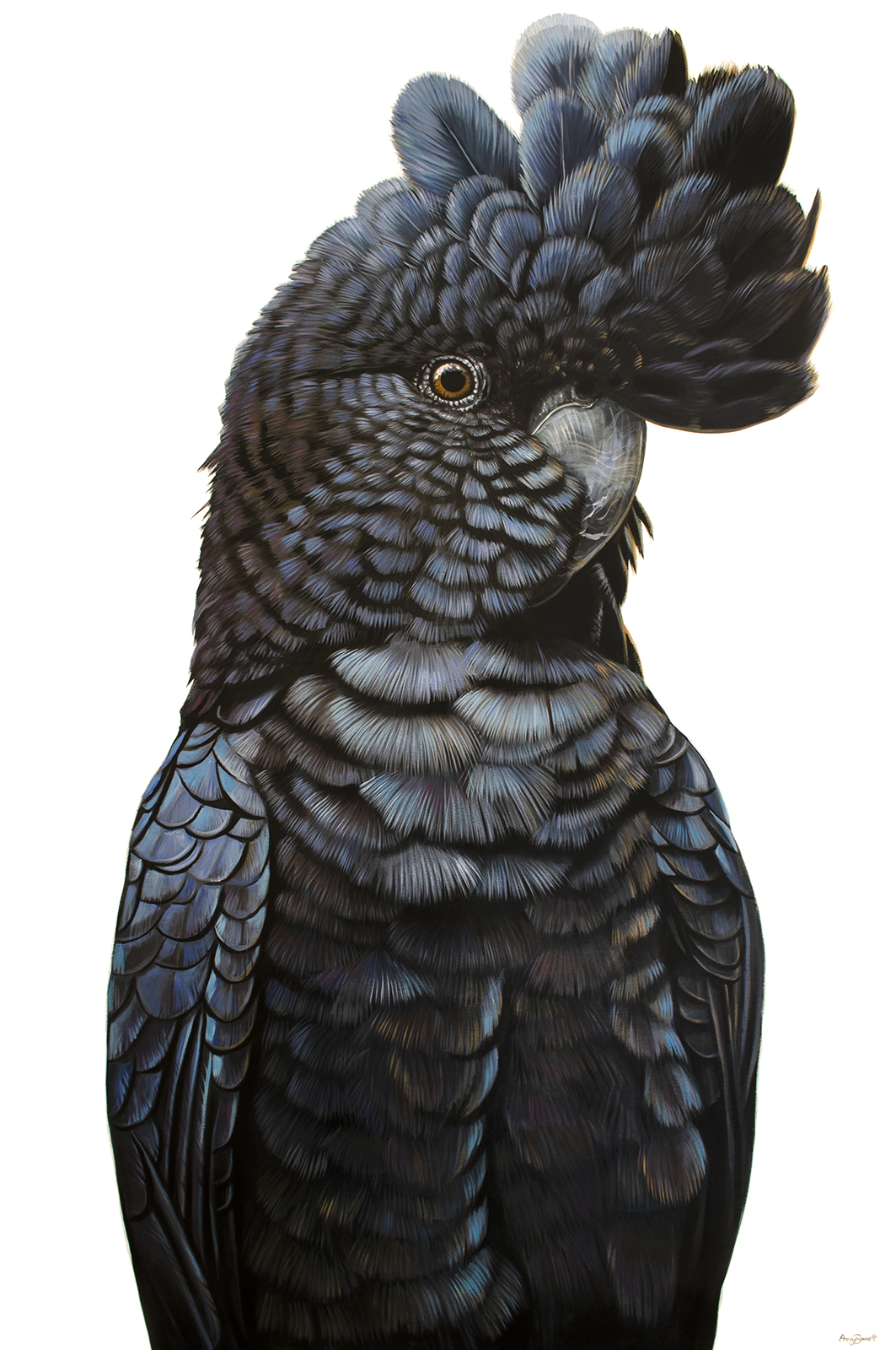 Todd, a majestic red-tailed black cockatoo captivates the viewer with just a look. The white background continues around the sides of the canvas which has a 4cm profile depth.