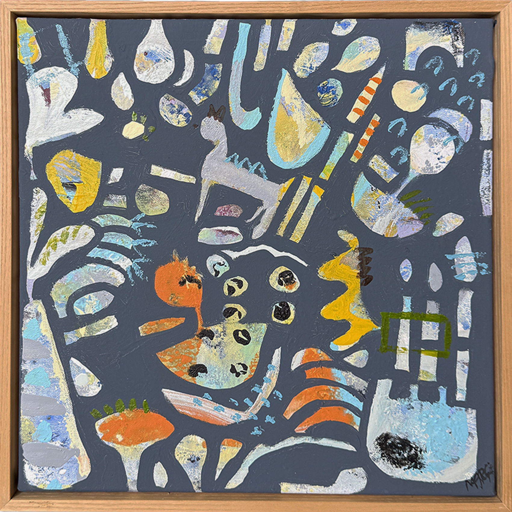 acrylic paint, oil paint, oil pastel, and conte on canvas framed in sustainable timber
