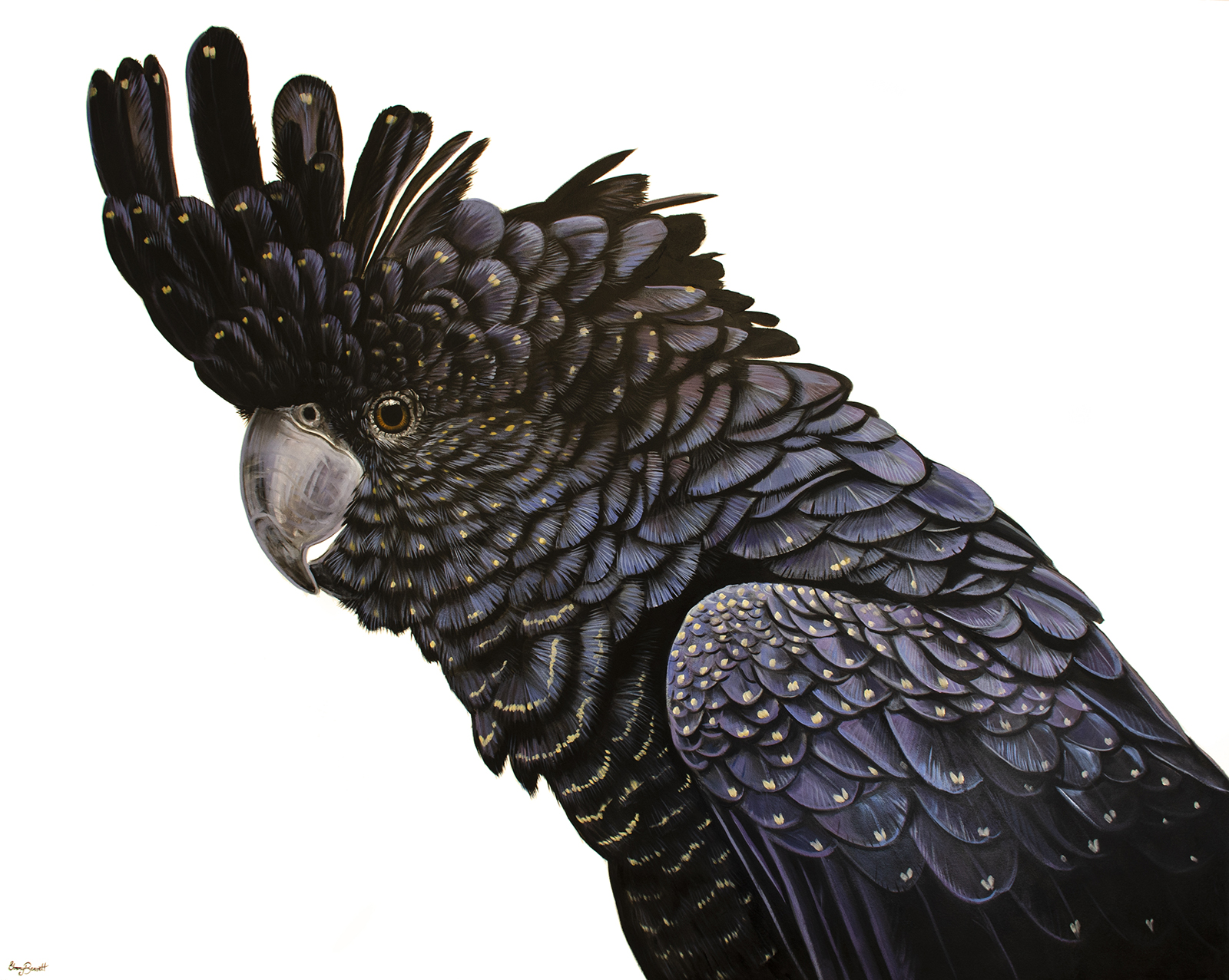 This landscape shows Winifred, a red-tailed black cockatoo and her exquisite layering of feathers. The white background continues around the sides of the canvas which has a 4cm profile depth.
